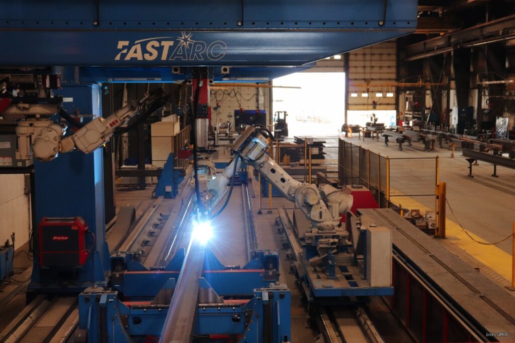 Included in infraMOD’s lineup of robotic automation equipment is our FastArc, which performs assembly, tack, finish welding, and quality control checks. The FastArc is highly capable and extremely precise. It drastically reduces the amount of time and manual labour required to fabricate the steel, thus resulting in significant labour savings across the board. The FastArc’s advanced technology ensures that the steel is fitted and welded with perfect accuracy. Using laser technology, the robot can scan and identify unique parts, ensuring they all have the correct dimensions and hole placements before fitting and welding them together with two simultaneous robotic welding arms.