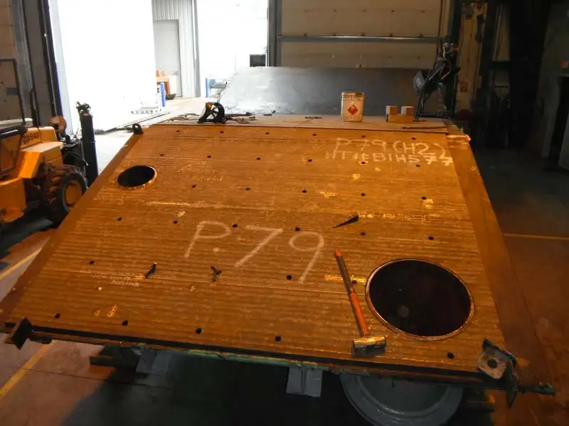 - The shell plates were up to 1-1/4” thick and had ½” on ½” thick chromium carbide overlay (CCO) plate over the majority of the inside surface area, with the remainder of the inside surface area covered with AR 400 wear plate. The liner plates had to be plug welded to the shell, requiring a three layer welding process, inclusive of capping with hard surfacing weld. Welding Data Sheets and procedures were developed for the plug welds for all-position welding, with the overhead corner welds of the liner plates presenting further challenges.